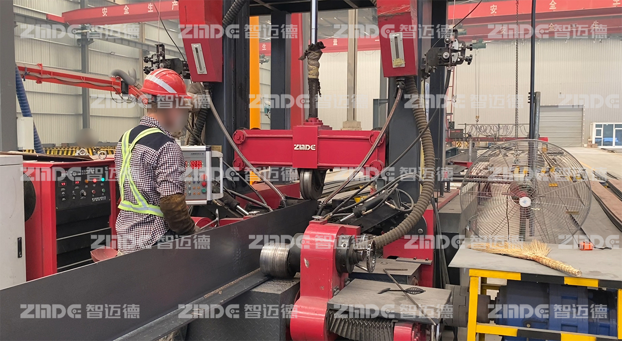2023年,該鋼構廠與智邁德達成合作,引進一臺裝配式H/T型建筑鋼梁組焊矯一體機。該設備組立、焊接、矯正“三位一體”,一臺設備替代傳統(tǒng)組立機、龍門焊、矯正機三臺設備,僅需1~2人即可操作,降低了人力成本,提高了生產(chǎn)效率。腹板18mm以下免坡口焊接,自動對中,無需點焊,熱焊熱矯,從頭焊到尾,滿足了生產(chǎn)需求,提升了產(chǎn)品品質。